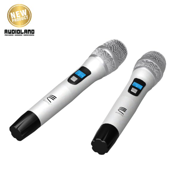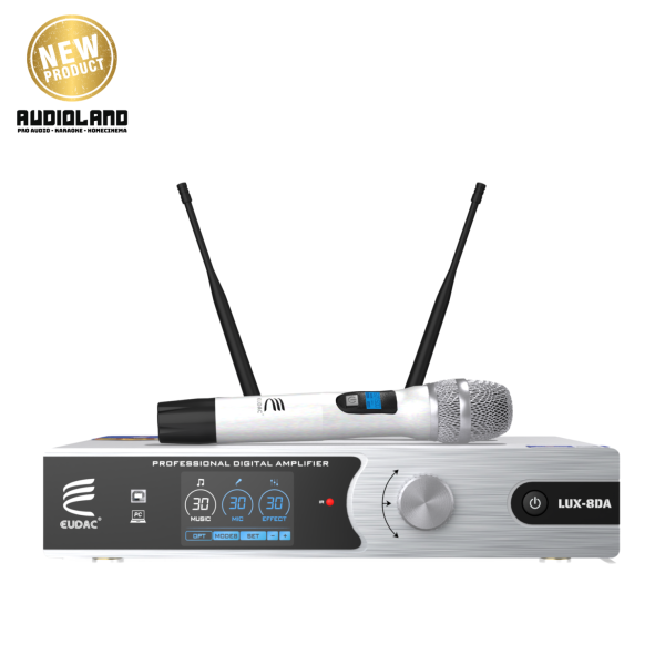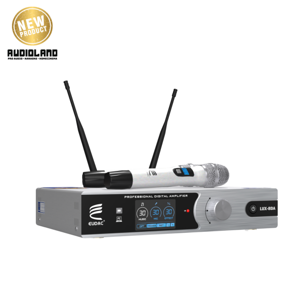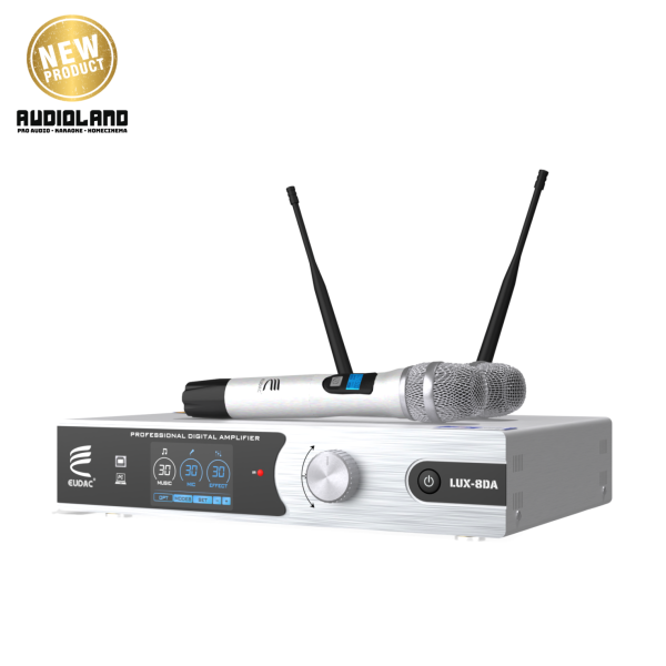 EUDAC LUX-8DA được trang bị hai micro không dây cao cấp, cùng tông màu bạc với amply tạo nên sự đồng nhất. Micro được thiết kế nhỏ gọn, thân cầm chắc tay, nút nguồn lớn giúp thao tác dễ dàng. Phần lưới micro dạng kim loại sáng bóng tạo cảm giác bền bỉ và hiện đại. Logo EUDAC in sắc nét trên thân, góp phần tạo nên sự chuyên nghiệp của toàn bộ hệ thống. Mặt sau ngoài các cổng kết nối đa dạng là ăng-ten thu sóng linh hoạt, giúp nâng cao khả năng bắt sóng và đảm bảo tín hiệu ổn định khi hát. Thiết kế gọn, dễ gấp gọn khi không sử dụng, góp phần giữ tổng thể sạch sẽ và gọn mắt.