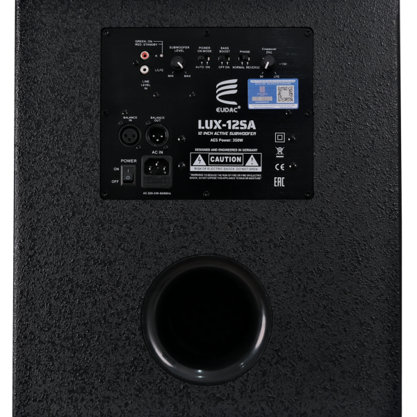 Mặt sau của loa Sub EUDAC AUDIO LUX-12SA được thiết kế khoa học, dễ dàng thao tác và kết nối. Khu vực bảng điều khiển được bố trí gọn gàng với các nút chỉnh Subwoofer Level, Bass Boost, và Crossover, cho phép người dùng tinh chỉnh âm trầm theo nhu cầu. Hệ thống cổng kết nối đa dạng gồm Line In/Out (RCA), Balanced In/Out (XLR) đáp ứng linh hoạt nhiều cấu hình âm thanh.